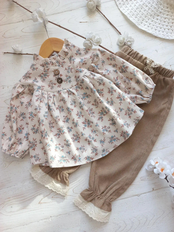 در کنار شومیز، شلوار مخمل کبریتی کرم قهوهای با پارچهای نرم و کشی دوخته شده تا آزادی حرکت و راحتی کامل را برای کودک فراهم کند. لبههای گیپوردوزیشده در پایین شلوار، هماهنگی زیبایی با طرح گلهای شومیز ایجاد کرده و استایل ست را تکمیل میکند.