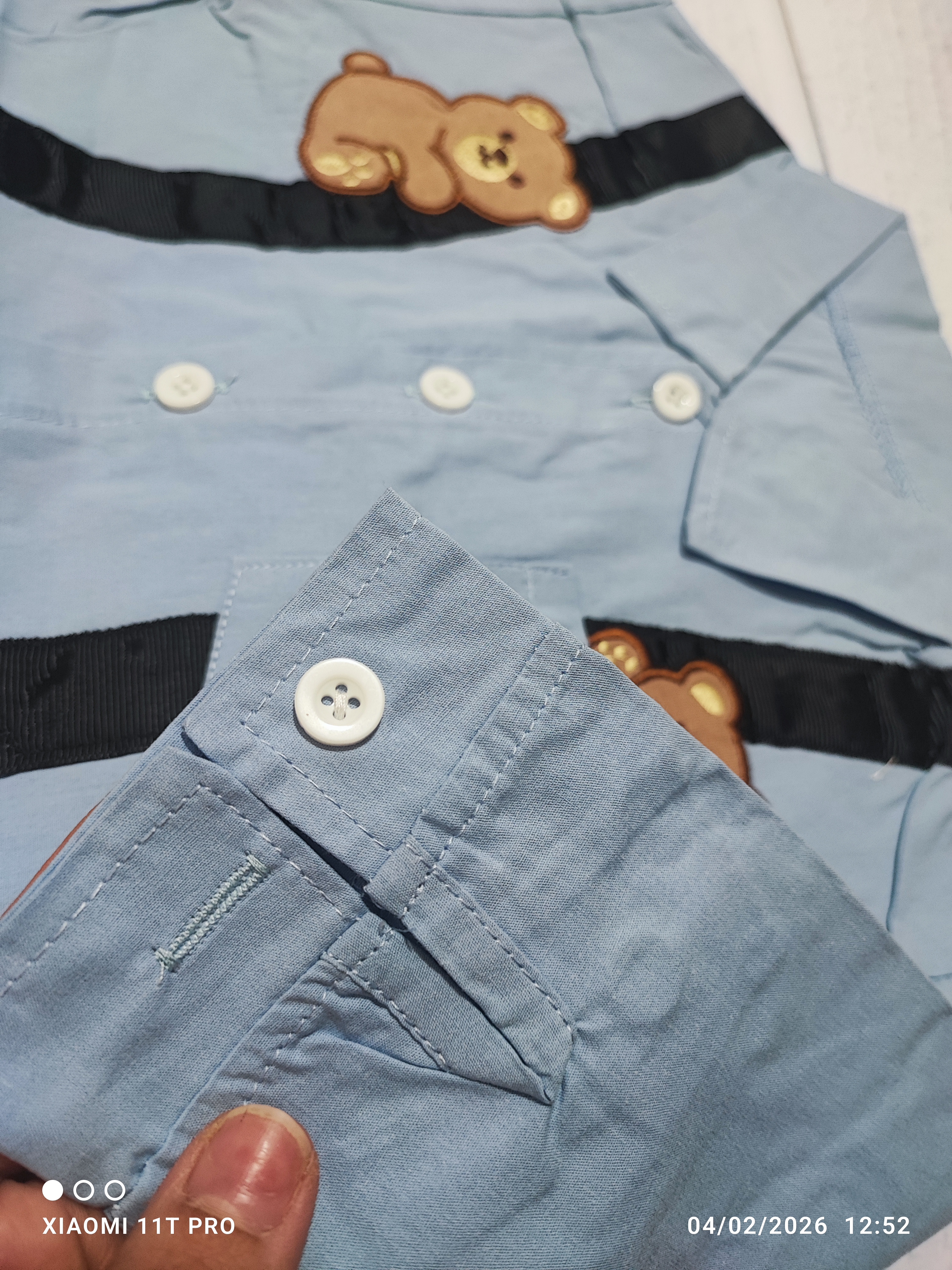 این ست دوستداشتنی شامل یک پیراهن آبی روشن و یک شلوار کبریتی بچگانه است که با طراحی فانتزی و جزئیات جذاب، انتخابی عالی برای استایل روزمره و مهمانیهای کودکانه محسوب میشود.